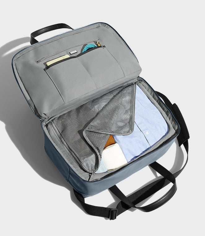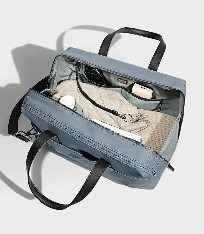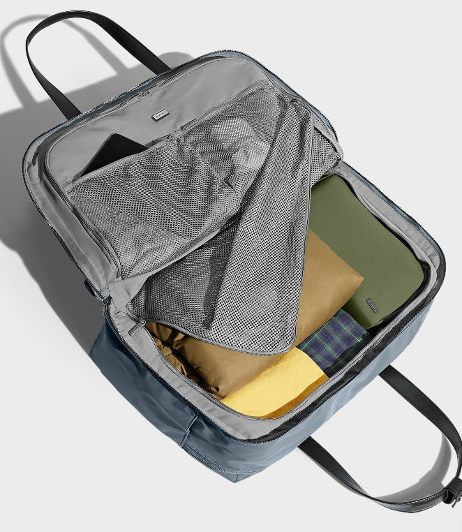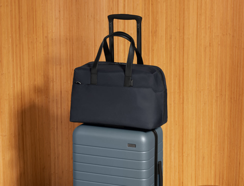 Front view of the Everywhere duffle bag Video of a person packing the Everywhere Bag and sliding onto an Away suitcase with its trolley sleeve Trolley sleeve on the back of an Everywhere Bag Main compartment packed with a light sweater, notebook, tablet, and water bottle. The detachable shoulder strap is clipped onto the bag. Laptop in the exterior laptop pocket A pair of keys attached to the key leash in the main compartment Person holding the Everywhere Bag by its leather straps Empty Everywhere Bag, showing the interior organization with multiple slip pockets, zippered pocket, and key leash The Everywhere Bag secured to an Away suitcase by its trolley sleeve
