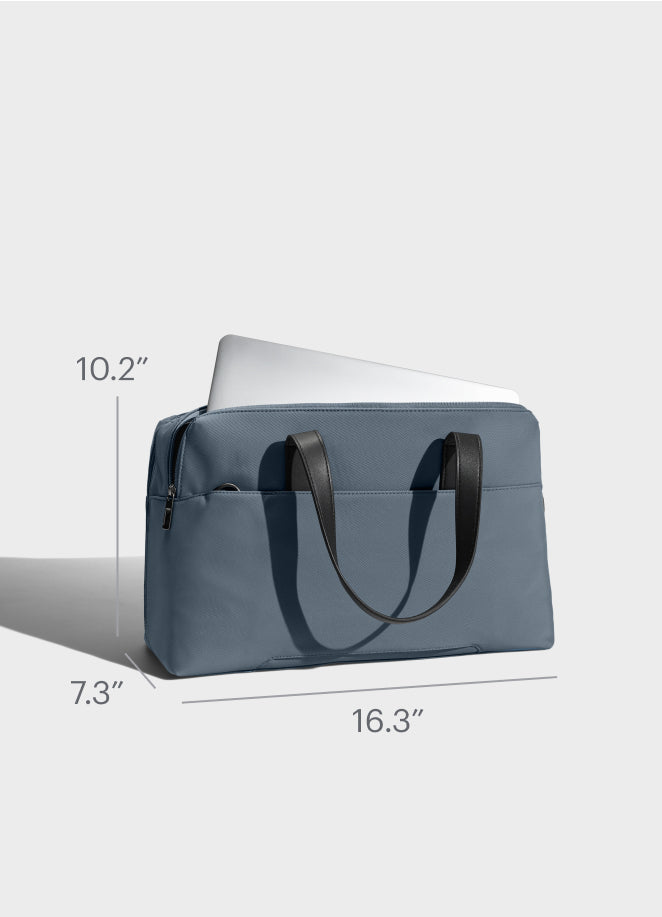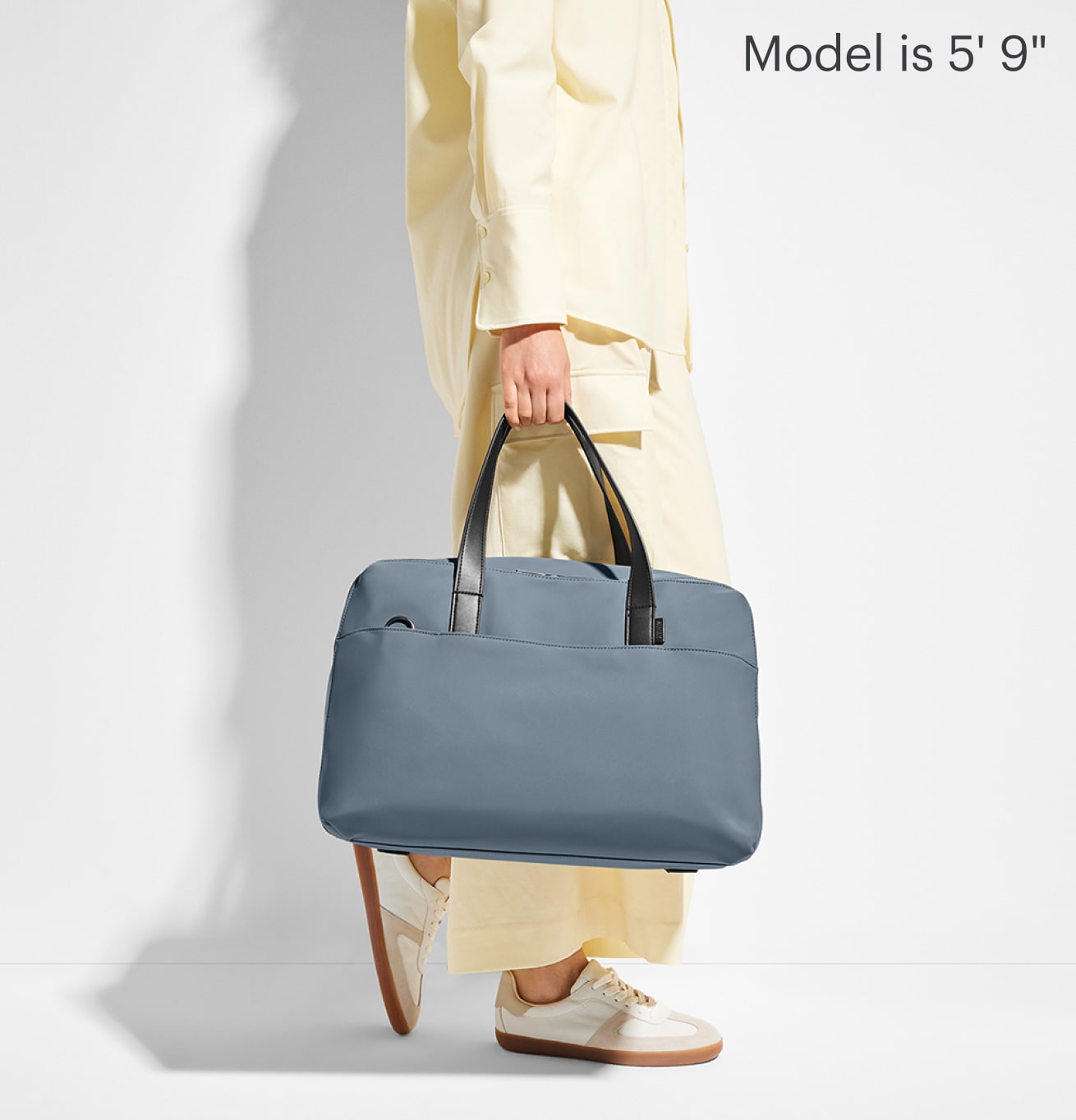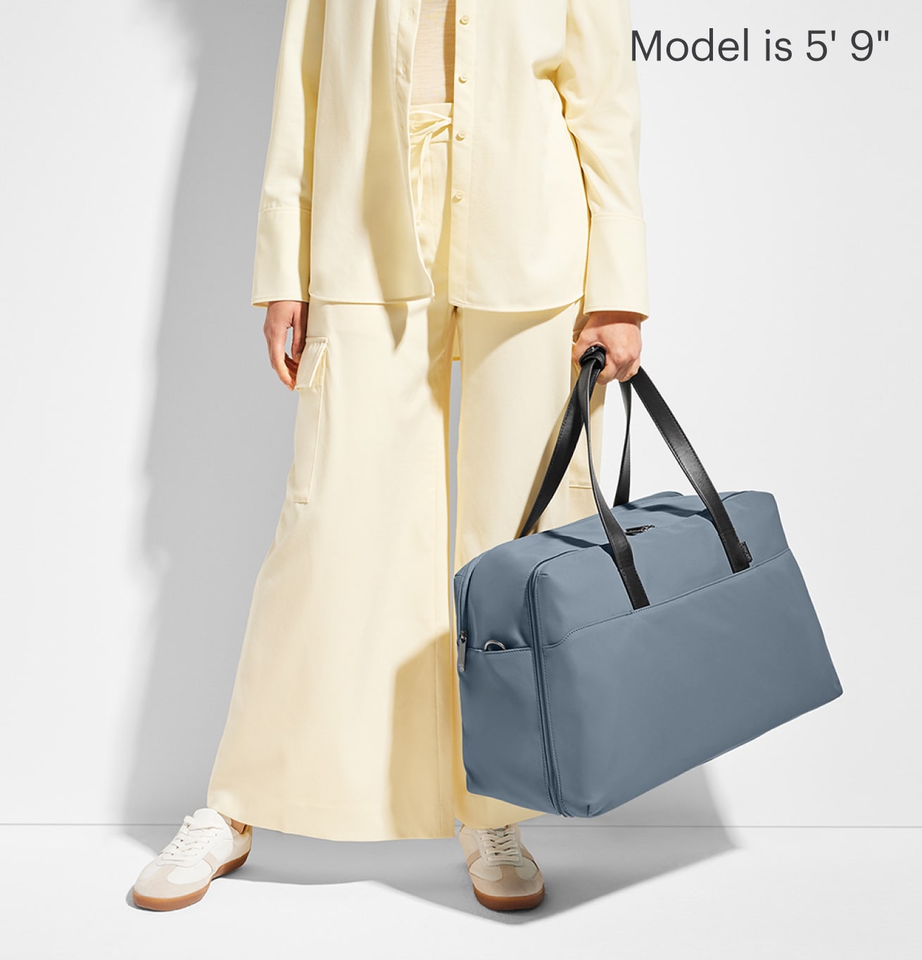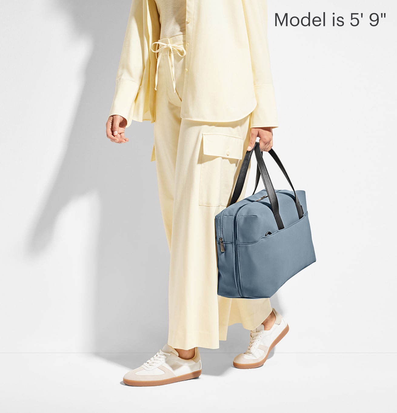 // Model is 5’9” Person holding the Everywhere Bag by its leather straps Model is 5’9”